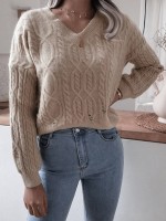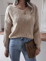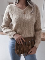 Apricot Casual V-neck Jacquard Hollow Out Long Sleeve Sweater