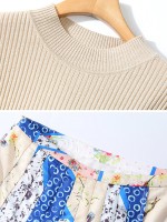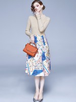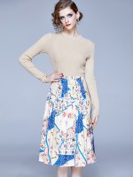 Apricot Round Neck Knit Top and Printed Skirt Set