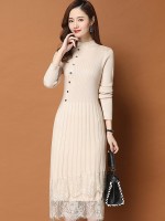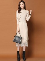 Apricot Stand Collar Knit Midi Dress with Lace Hem