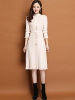 Apricot Stand Collar Tie Waist Knit Dress with Floral Hem