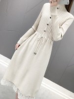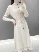 Apricot Stand Collar Tie Waist Knit Dress with Lace Trim
