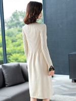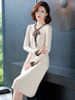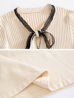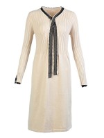 Apricot Tie Collar A-line Knit Dress with Lace Detail