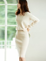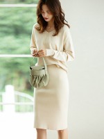 Apricot V-neck Knitted Sweaters And Skirts Sets