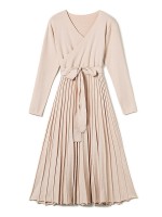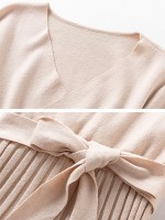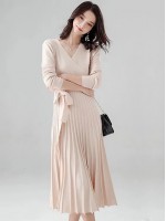 Apricot Wrap Style Tie Waist Knitted Pleated Dress