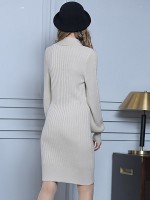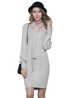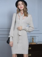 Beige V-neck Midi Knit Dresses With Necktie
