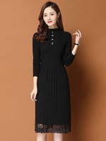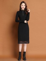 Black Round Neck Pleated Knit Dress with Lace Detail