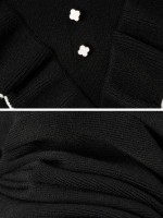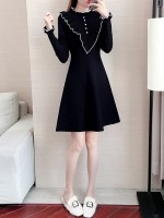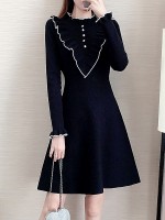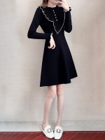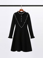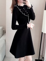 Black Stand Collar Knit A-line Dress in Ruffle Detail