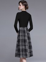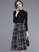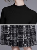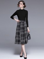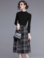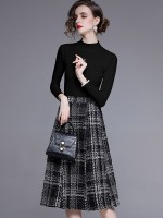 Black Stand Collar Knit Top with Plaid Skirt