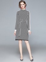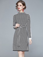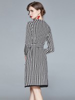 Black Standard Collar Houndstooth Knit Dress with Belt