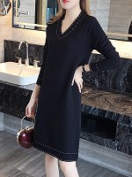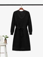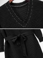 Black V- Neck Tie Waist Knit Dress
