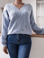 Blue Casual V-neck Jacquard Hollow Out Long Sleeve Sweater