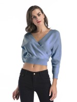 Blue Short Loose Bat Sleeve Plunge V-Neck Sweater