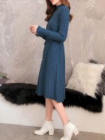 Blue Stand Collar Tie Waist Knit Dress with Floral Hem
