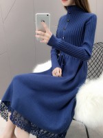 Blue Stand Collar Tie Waist Knit Dress with Lace Trim