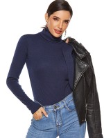 Blue Stand-collar Slim Solid Color Knit Sweater