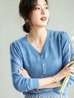 Blue V-Neck Hollow-out Knit Top