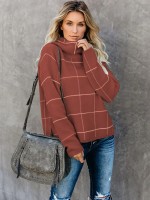 Brown Funnel Neck Street Knit Sweaters With Plaid Pattern