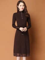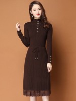 Brown Ribbed Knitted Dress with Lace Trim