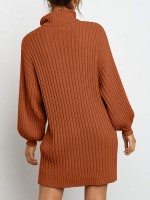 Brown Roll Neck Sweater Dress with Balloon Sleeves