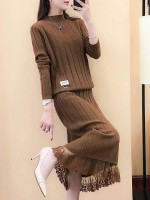 Brown Stand Collar Knitted Top and Skirt in Lace Trim