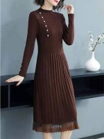 Brown Stand Collar Lace Trim Knit Midi Dress