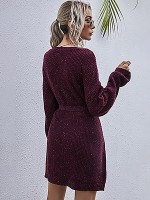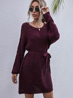 Burgundy Round Neck Tie Waist Knitted Dress