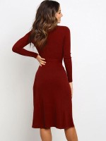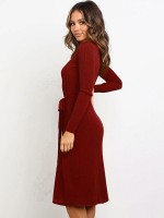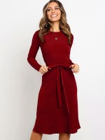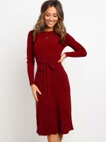 Burgundy Round Neck Tie Waist Knitted Dress