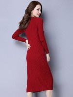 Burgundy Stand Collar Ribbed Knitted Midi Dress