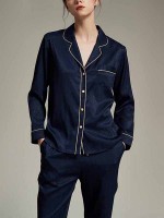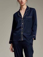 Navy Blue Classic Trimmed Satin Long Sleeves Pajama Set