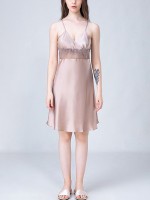 Coffee Eyelash Lace Panel Silk Cami Sleep Dress