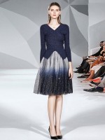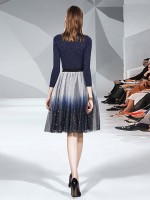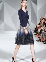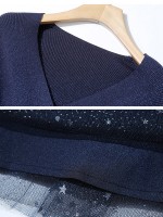 Dark Blue Knit Top with Asymmetric Hem & Sequined Gauze Skirt