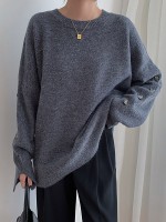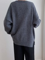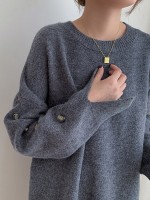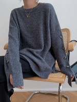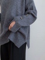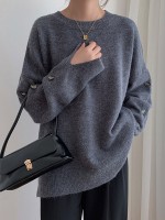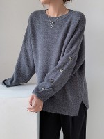 Gray Loose Slouchy Crew Neck Sweater With Button Decorations
