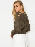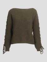 Green Boat Neck Long Sleeve Lace Up Knitted Sweater