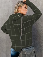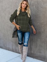 Green Funnel Neck Street Knit Sweaters With Plaid Pattern