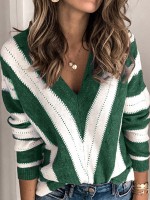 Green Oversize V-neck Knit Sweaters With Stripes Patterns