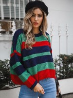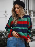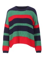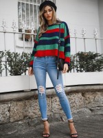 Green Round Neck Fashionable Colorful Stripe Knitted Sweater