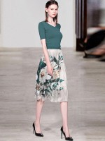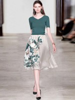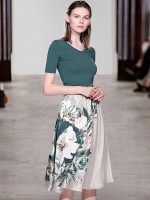 Green V-neck Knit Top with Floral Print Skirt
