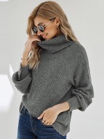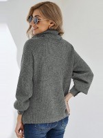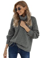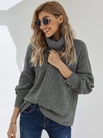Grey Oversize Funnel Neck Button Details Knit Sweaters