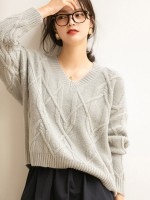 Grey Twisted V-neck Loose Warm Knit Sweaters