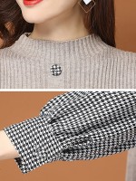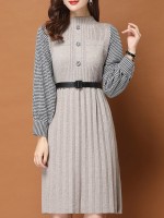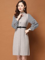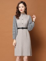 Khaki Knitted Mini Dress with Check Print Shirt Sleeves