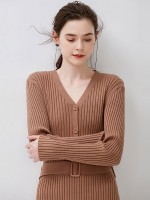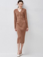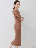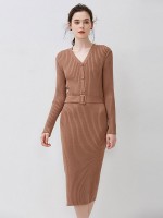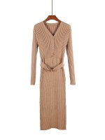 Khaki V Neck Ribbed Style Belted Waist Pencil Dress