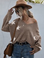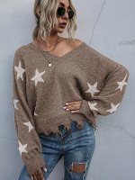 Khaki V-neck Printed Stars Pattern Knit Sweaters