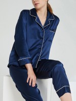 Navy Blue Classic Trimmed Silk Pajama Set