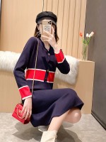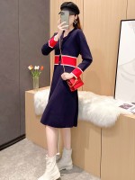Navy Blue Color Block V-neck Knitted Dress