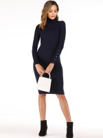 Navy Blue High Neck Dress with Button Decoration