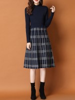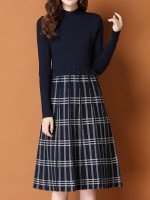 Navy Blue Knitted Dress in Check Print