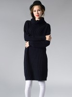 Navy Blue Loose Midi Knit Dresses With Funnel Neck