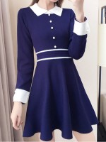 Navy Blue Round Neck Knitted Dress with Faux Pearl Button