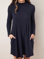 Navy Blue Stand Collar Ribbed Shift Dress