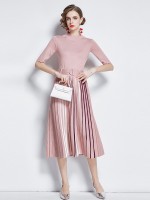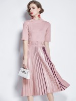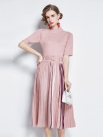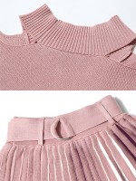 Pink Cutout Shoulder Knit Pleated Midi Dress